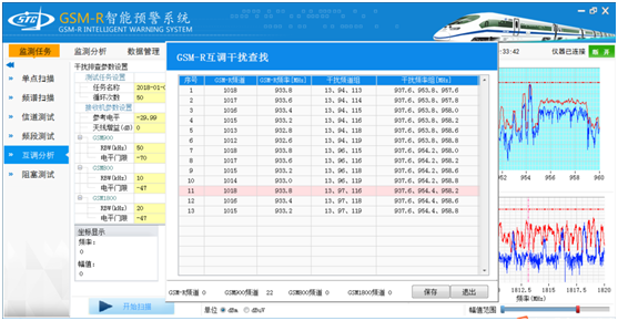 具有成熟的互調干擾分析和阻塞抑制分析軟件,可根據現場測試情況自動判斷是否有互調產物落在GSM-R頻段內,具備大信號阻塞檢測功能,能排查分析外部強干擾信號對GSM-R上下行頻段造成的阻塞干擾,該功能需求專為GSM-R頻段開發,滿足鐵路沿線環境下的互調干擾分析和阻塞干擾分析。