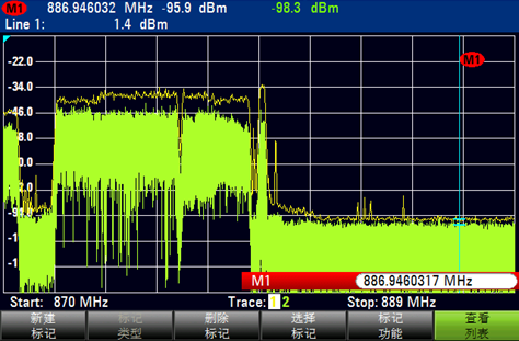通過使用頻譜儀對現場無線電環境進行測試,在該點對GSM-R上行頻段885MHz-889MHz進行頻譜掃描和底噪監測后發現,該點GSM-R上行本底噪聲在-98.3dBm左右,并未發現明顯干擾問題,同時監測當前區域內中國電信CDMA基站信號發射情況,也不存在電信信號拖尾或者大功率雜散對GSM-R上行的干擾,具體測試頻譜圖參見下圖: