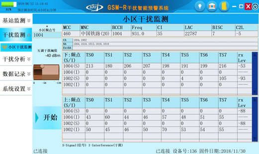繼續鎖定當前小區BCCH頻點,對當前小區每個頻點每個時隙的信號和干擾數量進行實時監測,可以判斷當前小區頻點受干擾情況,通過監測數據可以看出該小區的頻點1004和1002均存在上行干擾,監測數據如下圖所示;